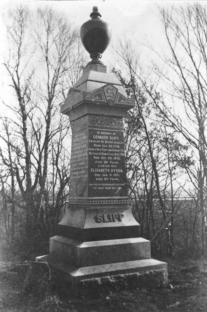 Slipp gravestone Slipp/Merritt Cemetery, Queenstown, Queens Co., New Brunswick. Gravestone erected in 1903 by Slipp descendants. Photo from Murray S. Thomson. Rick Crume's file P 178. |
